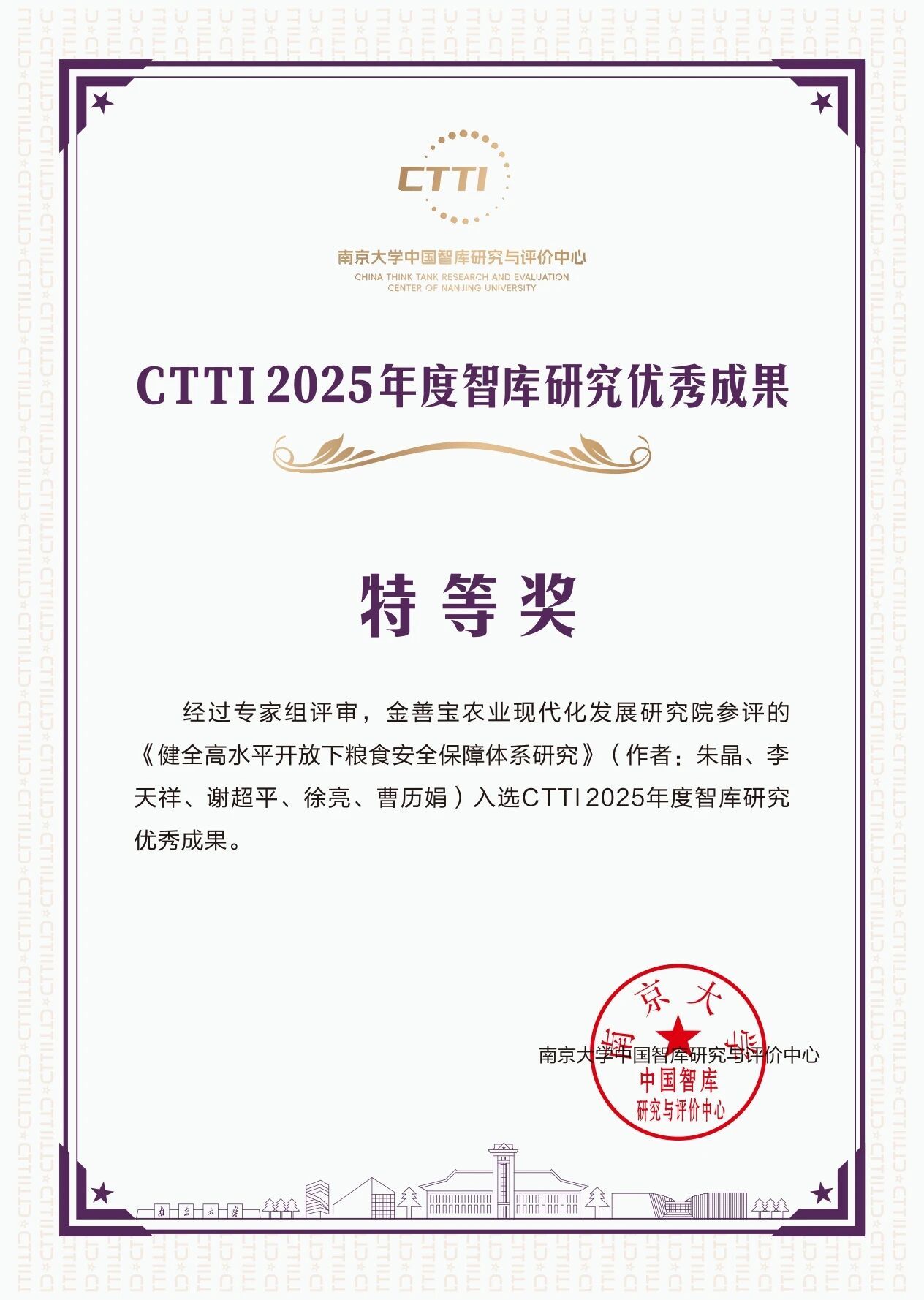 其中,南京农业大学金善宝农业现代化发展研究院《健全高水平开放下粮食安全保障体系研究》(作者:朱晶、李天祥、谢超平、徐亮、曹历娟)入选CTTI 2025年度智库研究优秀成果特等奖。